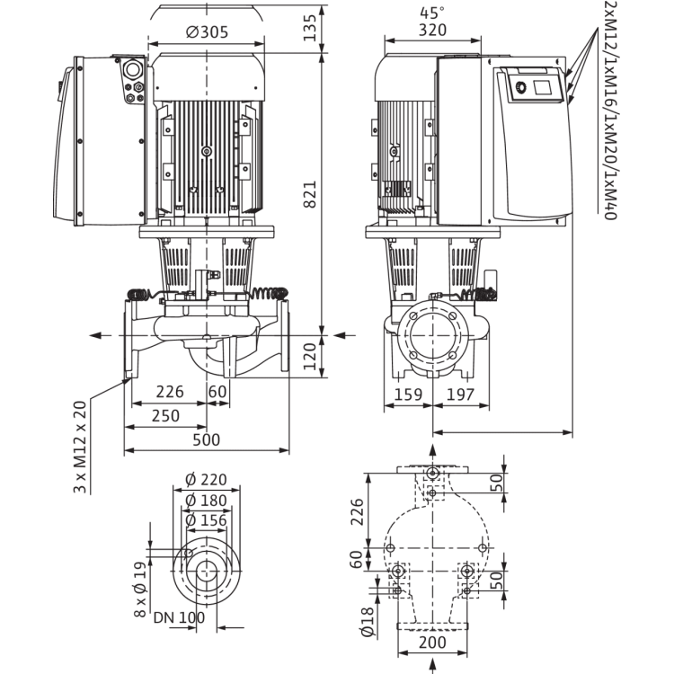 - Спиральный корпус линейного исполнения (всасывающий и напорный патрубок с одинаковыми фланцами в одной линии), фланец PN 16 – с отверстием согласно EN 1092-2