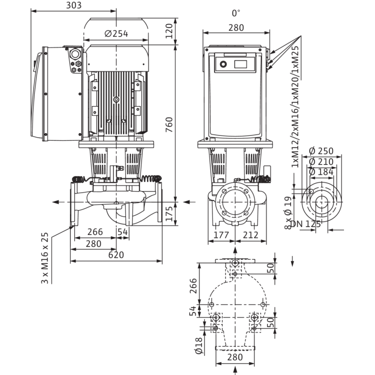 - Спиральный корпус линейного исполнения (всасывающий и напорный патрубок с одинаковыми фланцами в одной линии), фланец PN 16 – с отверстием согласно EN 1092-2