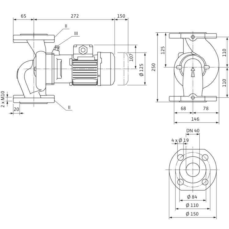 Насос с сухим ротором в линейном исполнении с резьбовым или фланцевым подсоединением.