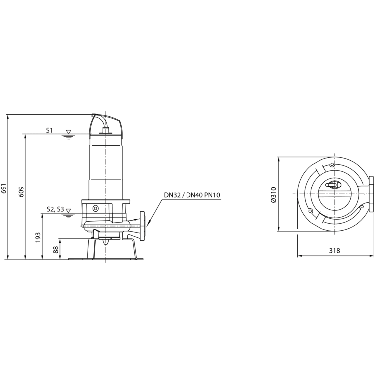 Полностью погружной дренажный насос для сточных вод с внутренним режущим механизмом для вертикальной установки в погруженном состоянии, для перекачивания коммунальных и промышленных сточных вод, содержащих фекалии, а также длинноволокнистые фракции. Корпус гидравлической части и рабочее колесо из серого чугуна, корпус электродвигателя из нержавеющей стали, уплотнение со стороны насоса и электродвигателя с двумя независимыми скользящими торцевыми уплотнениями. Напорный патрубок с горизонтальным патрубком напорного слива и резьбовым/фланцевым соединением. Электродвигатель насоса с сухим ротором в трехфазном исполнении с защитой от перегрева и с камерой уплотнений. Соединительный кабель со свободным концом.
