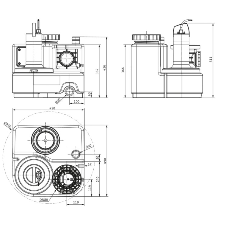 Компактная, готовая к подключению, полностью затапливаемая установка водоотведения с одинарным насосом для перекачивания сточных вод с содержанием фекалий.