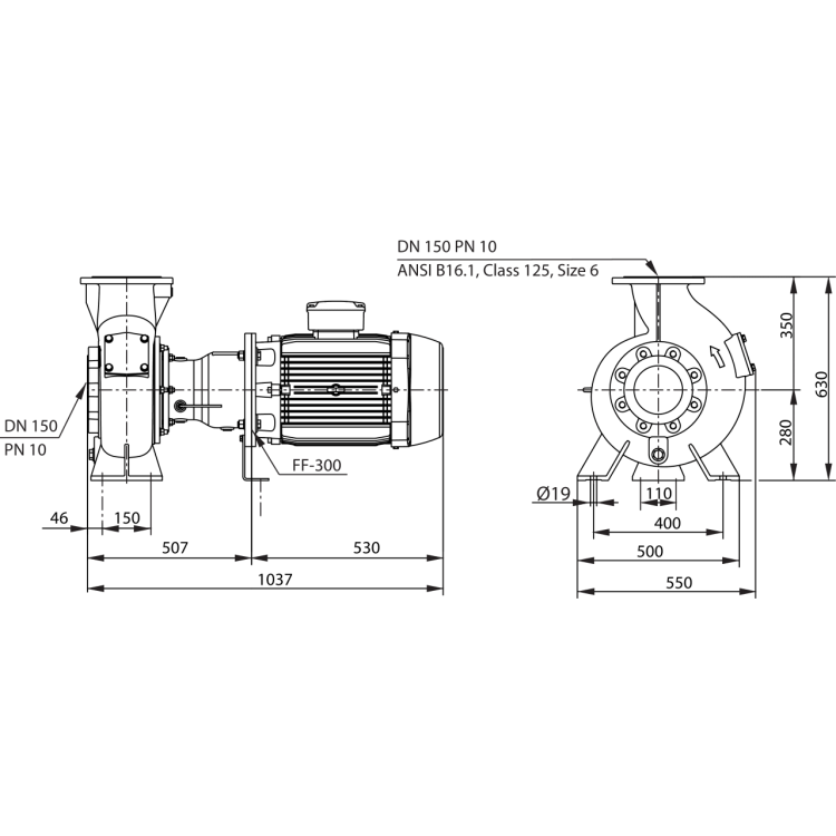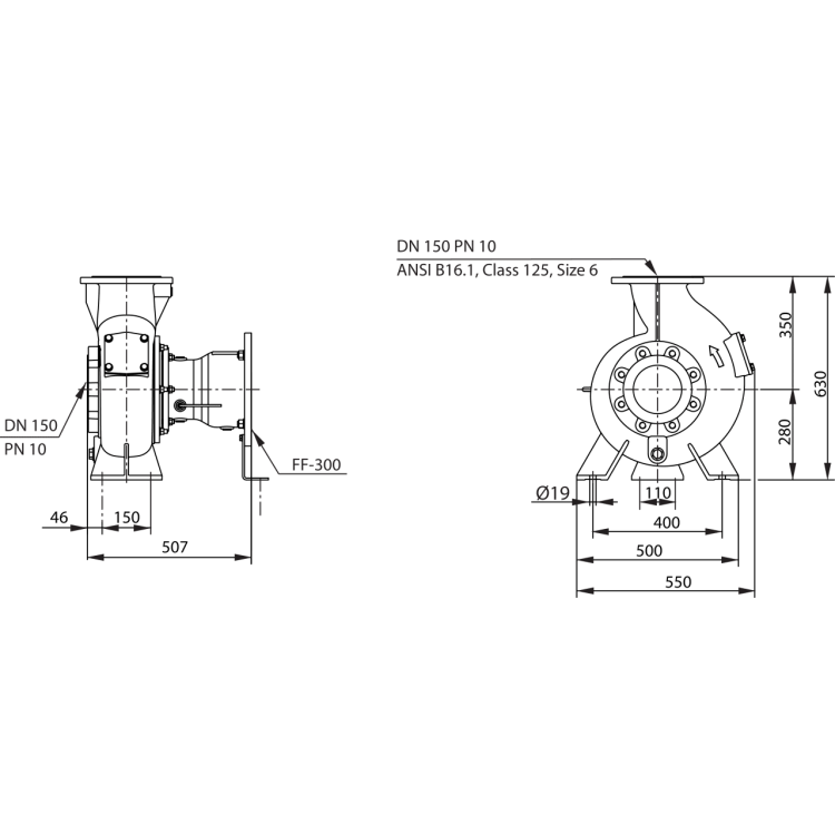 Одноступенчатая центробежная гидравлическая часть со стандартным электродвигателем IEC компактной блочной конструкции для горизонтальной установки в непогруженном состоянии для перекачивания загрязненной воды и неочищенных сточных вод с фекалиями. Гидравлическая часть с аксиальным всасывающим патрубком, радиальным напорным патрубком и подшипниковым узлом в виде законченного блока. Подшипниковый узел с камерами уплотнений и сбора утечек для улавливания поступающей перекачиваемой жидкости посредством уплотнений, расположенных со стороны рабочей среды и со стороны электродвигателя. Гидравлический корпус, рабочее колесо и подшипниковый узел из серого чугуна, уплотнение со стороны перекачиваемой жидкости посредством скользящего торцового уплотнения, не зависящего от направления вращения, уплотнение со стороны электродвигателя посредством радиального манжетного уплотнения. Камера уплотнений дополнительно может контролироваться внешним стержневым электродом. Стандартный электродвигатель IEC в исполнении B5 в виде трехфазного электродвигателя с датчиком контроля температуры обмотки и классом эффективности IE3.