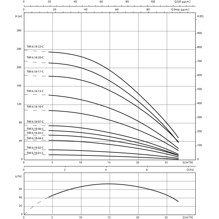 Полностью погружной многоступенчатый насос для перекачивания технической и питьевой воды (допуск ACS) с радиальными или полуосевыми рабочими колесами в секционном исполнении для вертикального и горизонтального монтажа со встроенным обратным клапаном. Стойкий к коррозии трехфазный электродвигатель для прямого или звездообразного треугольного пуска с заполнением водогликолевой смесью или питьевой водой. Герметичный электродвигатель с обмоткой с изолирующей лакировкой, пропиткой смолой или возможностью перемотки изоляцией ПВХ, а также с самосмазывающимися подшипниками. Охлаждение электродвигателя осуществляется перекачиваемой средой. Этот агрегат всегда должен эксплуатироваться в погруженном состоянии. Необходимо соблюдать предельные значения максимальной температуры перекачиваемой жидкости и минимальную скорость потока. Вертикальный монтаж можно выполнить с охлаждающим кожухом или без него — на выбор заказчика. Горизонтальный монтаж всегда выполняется с охлаждающим кожухом.