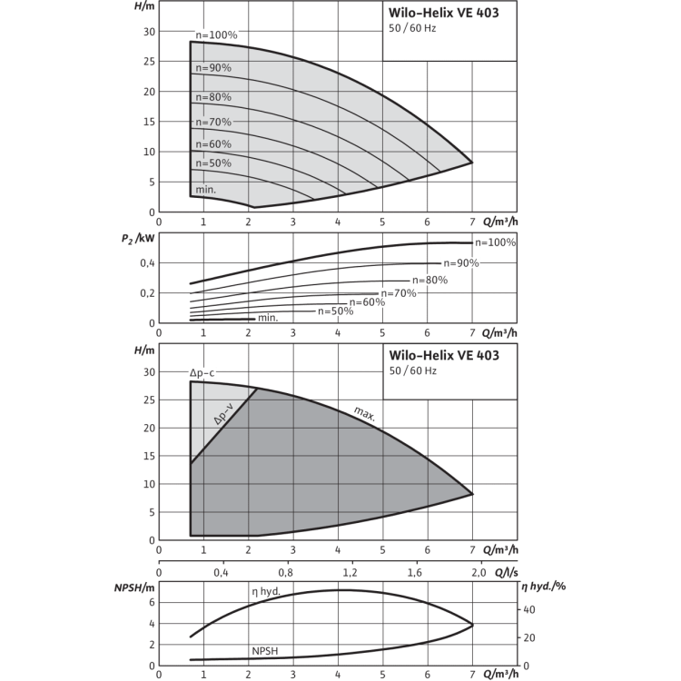 Общие указания – директивы ErP (экологический дизайн) Базовое значение MEI для насосов с оптимальным КПД ≥ 0,70.КПД насоса с откорректированным рабочим колесом, как правило, ниже КПД насоса с полным диаметром рабочего колеса. За счет корректировки рабочего колеса насос настраивается на определенную рабочую точку, в результате чего снижается энергопотребление. Индекс минимальной эффективности (MEI) относится к полному диаметру рабочего колеса.При различных рабочих точках данный насос может работать эффективнее и экономичнее, если, например, управление его работой осуществляется путем регулирования переменной частоты вращения, благодаря которому насос адаптируется к характеристикам соответствующей системы.Информацию по базовому значению эффективности см. на интернет-странице www.europump.org/efficiencycharts.На насосы, потребляющие мощность > 150 кВт, или имеющие подачу QBEP < 6 м3/ч, не распространяются требования по экологическому проектированию водяных насосов. Поэтому значение MEI не указывается. |