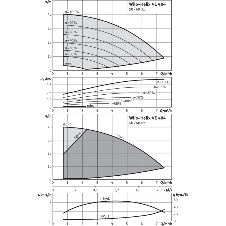 Общие указания – директивы ErP (экологический дизайн) Базовое значение MEI для насосов с оптимальным КПД ≥ 0,70.КПД насоса с откорректированным рабочим колесом, как правило, ниже КПД насоса с полным диаметром рабочего колеса. За счет корректировки рабочего колеса насос настраивается на определенную рабочую точку, в результате чего снижается энергопотребление. Индекс минимальной эффективности (MEI) относится к полному диаметру рабочего колеса.При различных рабочих точках данный насос может работать эффективнее и экономичнее, если, например, управление его работой осуществляется путем регулирования переменной частоты вращения, благодаря которому насос адаптируется к характеристикам соответствующей системы.Информацию по базовому значению эффективности см. на интернет-странице www.europump.org/efficiencycharts.На насосы, потребляющие мощность > 150 кВт, или имеющие подачу QBEP < 6 м3/ч, не распространяются требования по экологическому проектированию водяных насосов. Поэтому значение MEI не указывается. |